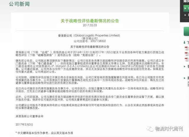 2月3日,普洛斯发布《关于战略性评估最新情况的公告》,承认公司已收到各当事方就战略性评估提交的非约束性提案。普洛斯目前已成立专门委员会,由四名独立董事组成并由董事会主席薛义华博士主持,负责监督本次战略性评估。专门委员会将在公司财务顾问J.P. Morgan (S.E.A.) Limited以及公司法律顾问Allen & Gledhill LLP的协助下评估各方的提案。